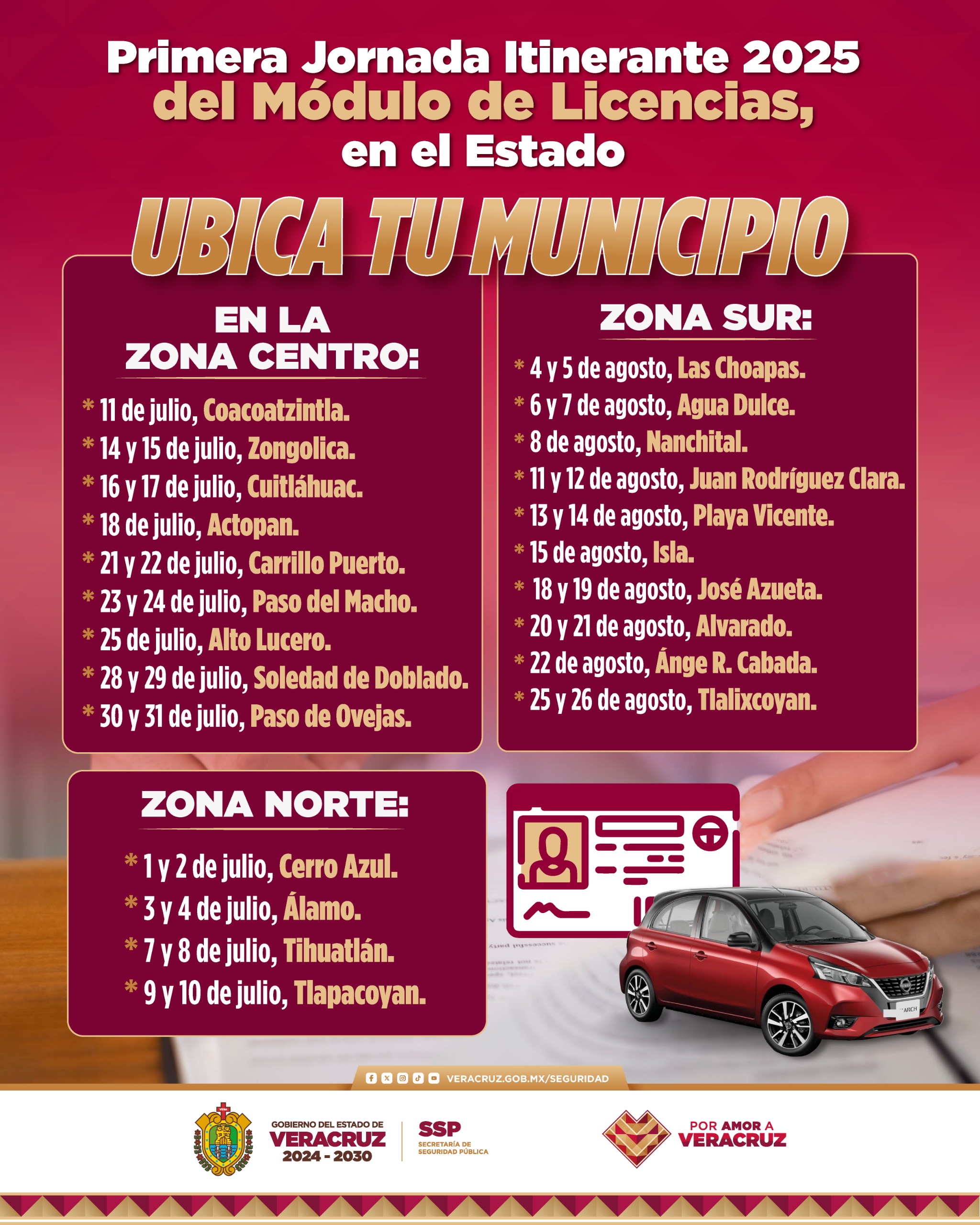 Xalapa, Ver., martes 01 de julio de 2025.- La Secretaría de Seguridad Pública (SSP), a través de la Dirección General de Transporte del Estado, implementa del 01 de julio al 26 de agosto la Primera Jornada Itinerante 2025 del Módulo de Licencias, acercando este servicio a diversas regiones y facilitar el trámite a la población.