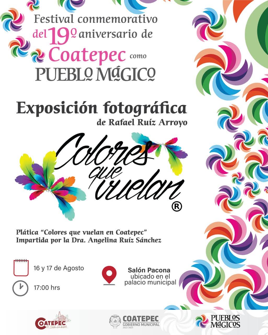 Coatepec.- El Ayuntamiento de Coatepec, invitó a la Exposición Fotográfica Colores que vuelan, del artista Rafael Ruíz Arroyo, en el marco del Festival conmemorativo por el 19º aniversario de Coatepec como Pueblo Mágico, este sabado 16 y domingo 17 de agosto.