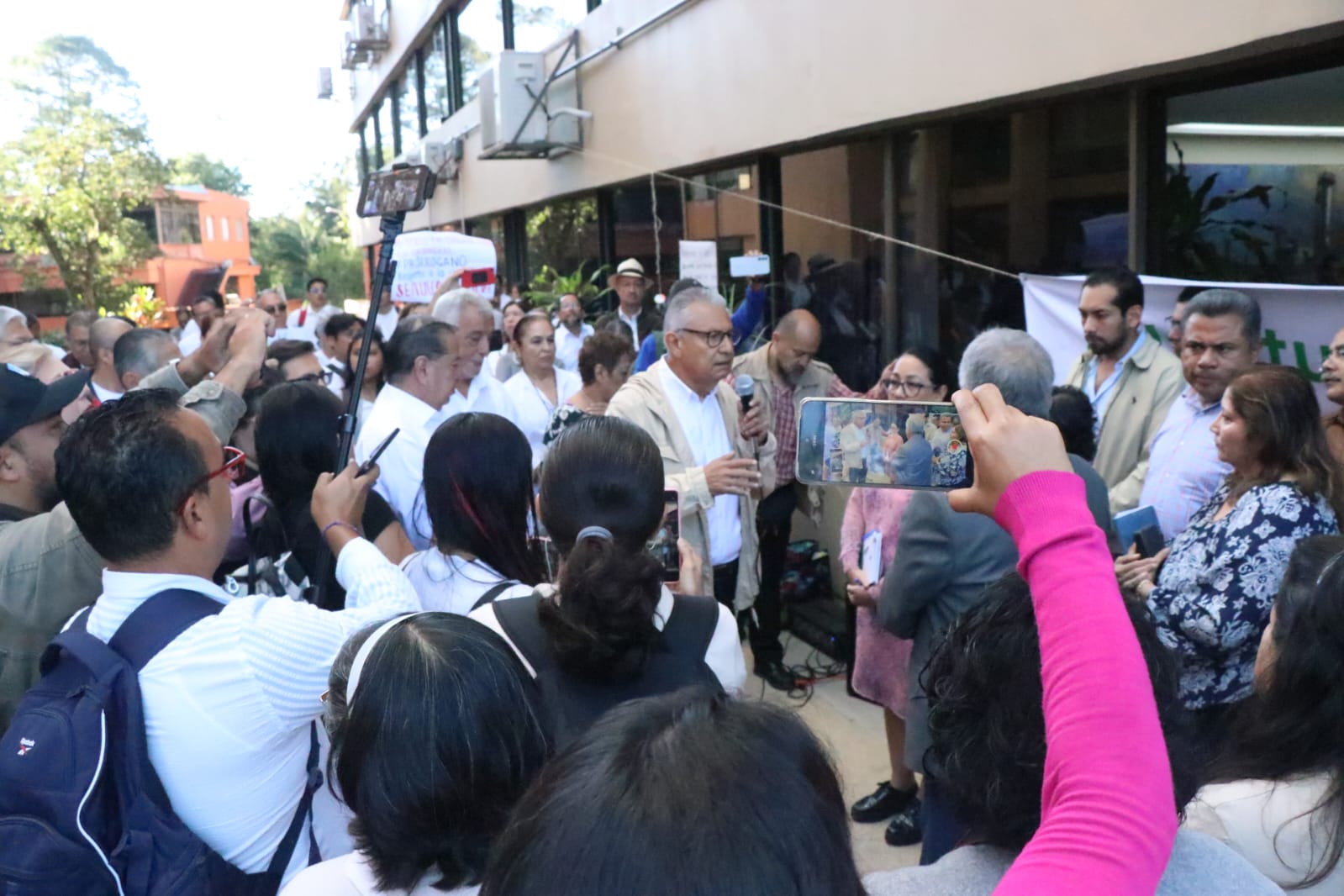En su mensaje, acompañado por la exrectora Sara Ladrón de Guevara, así como por los aspirantes al cargo de rector como Marisol Luna, Jorge Manzo Denes y Rafael Vela, y por un grupo de integrantes de la comunidad universitaria; el académico manifestó que esta era una primera acción en defensa de la legitimidad y de la legalidad de la UV.