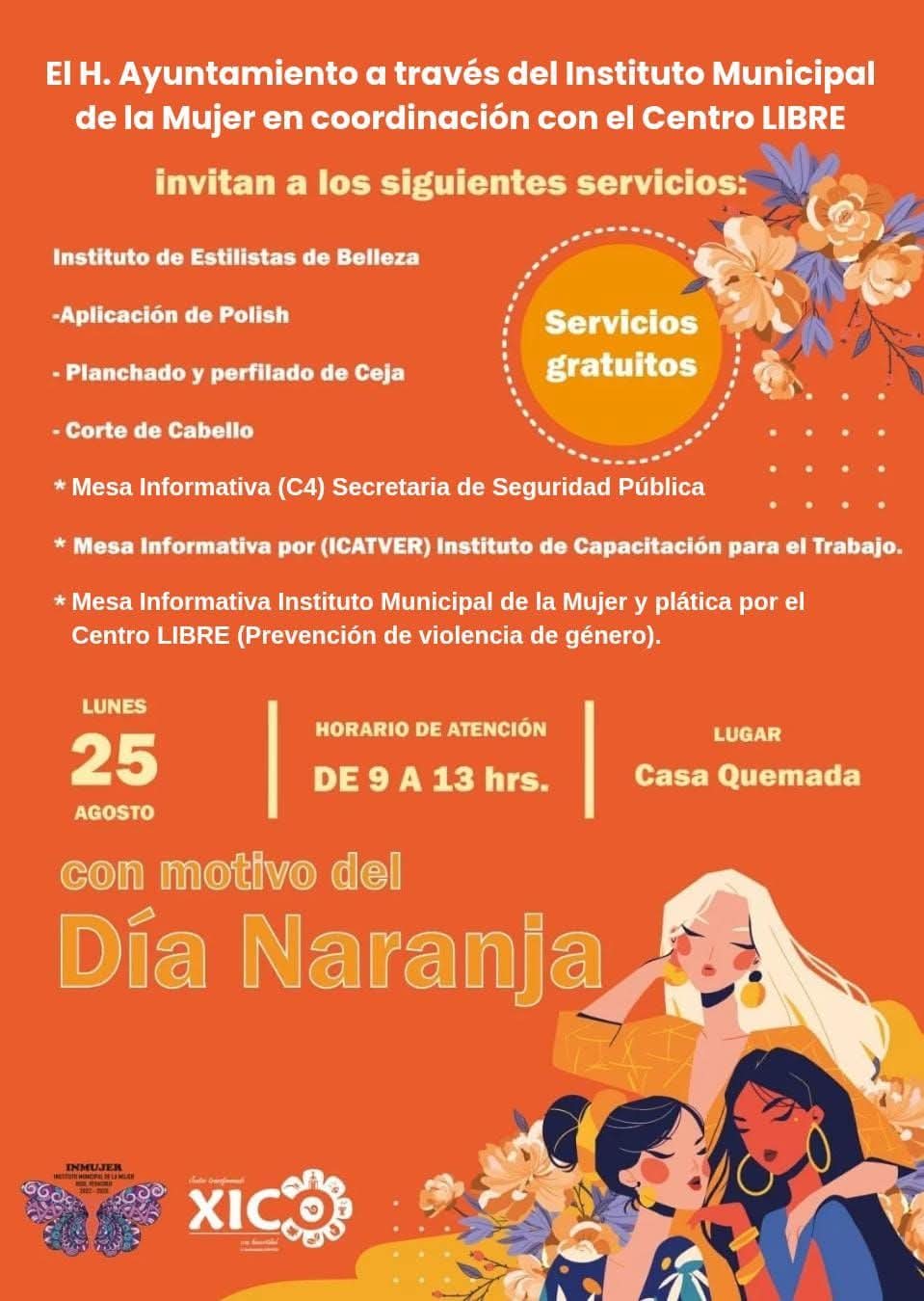 Xico.- Con motivo del Día Naranja, el Ayuntamiento de Xico a través del Instituto Municipal de la Mujer en coordinación con el Centro LIBRE invitan a los siguientes servicios:
