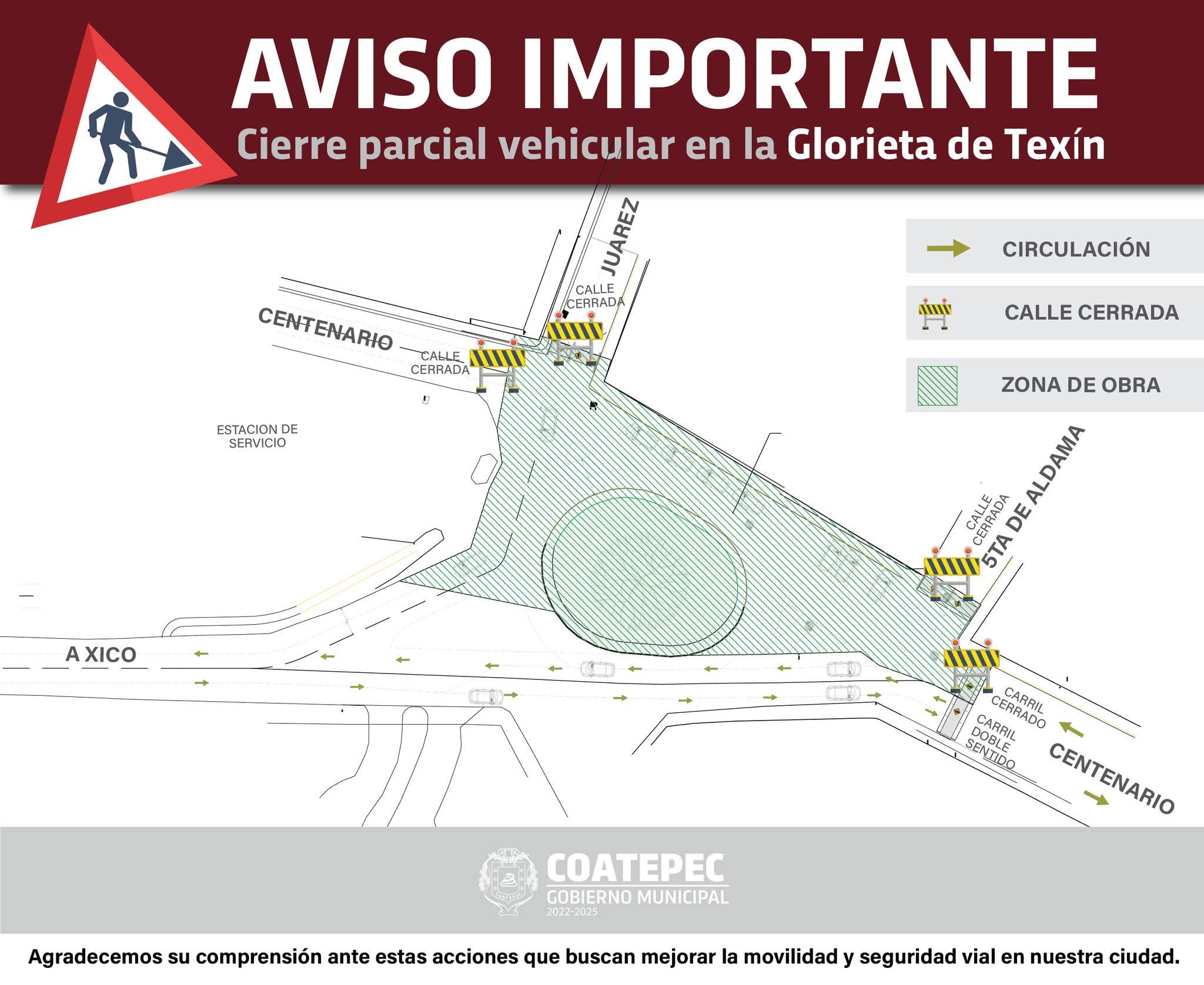 Coatepec.- El Ayuntamiento de Coatepec, informó que mañana miércoles a partir de las 07:00 horas se aplicará un cierre parcial en la circulación de la Glorieta de Texín.
