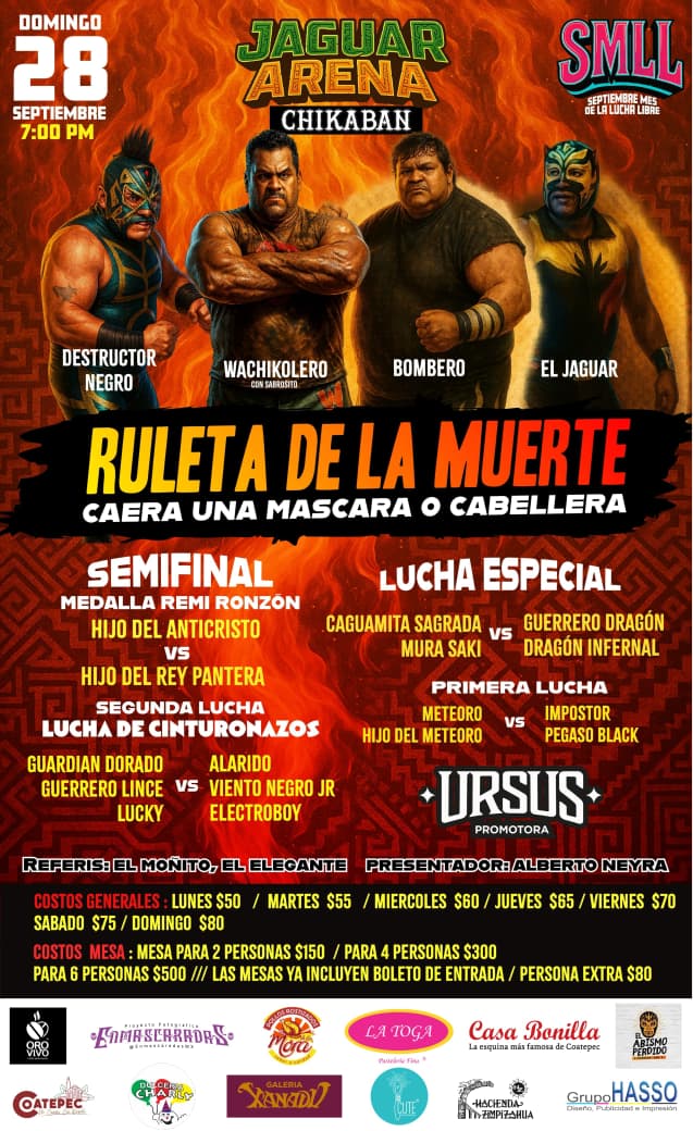 Coatepec.- La emoción de la lucha libre llega a su punto culminante este domingo 28 de septiembre, cuando se lleve a cabo el gran desenlace de SMLL: Septiembre, Mes de la Lucha Libre, en la Jaguar Arena Chikaban, a partir de las 7:00 p.m.