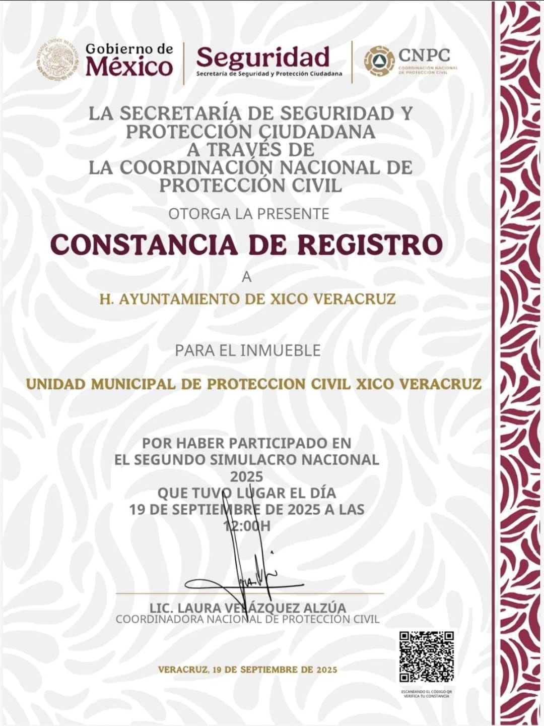 Xico, Ver.- La Secretaría de Seguridad y Protección Ciudadana, a través de la Coordinación Nacional de Protección Civil, otorgó una constancia de participación al Ayuntamiento de Xico y a la Unidad Municipal de Protección Civil, por su destacada colaboración en el Segundo Simulacro Nacional 2025, realizado en punto de las 12:00 horas.