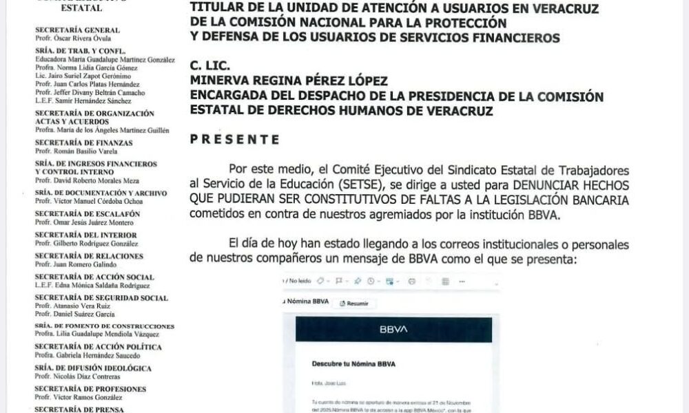 Xalapa.- El Sindicato Estatal de Trabajadores al Servicio de la Educación (SETSE), que dirige el Profesor Óscar Rivera Óvula, denunció que la institución bancaria BBVA estaría...