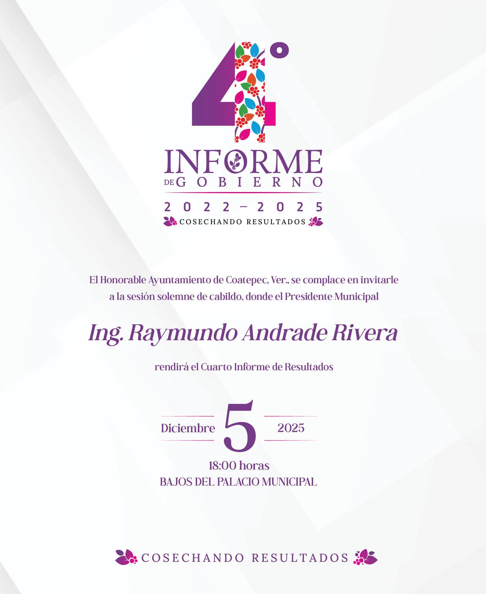 Coatepec.- El Ayuntamiento de Coatepec convocó a la ciudadanía a asistir a la Sesión Solemne de Cabildo con motivo del Cuarto Informe de Labores del presidente municipal, Raymundo Andrade Rivera.