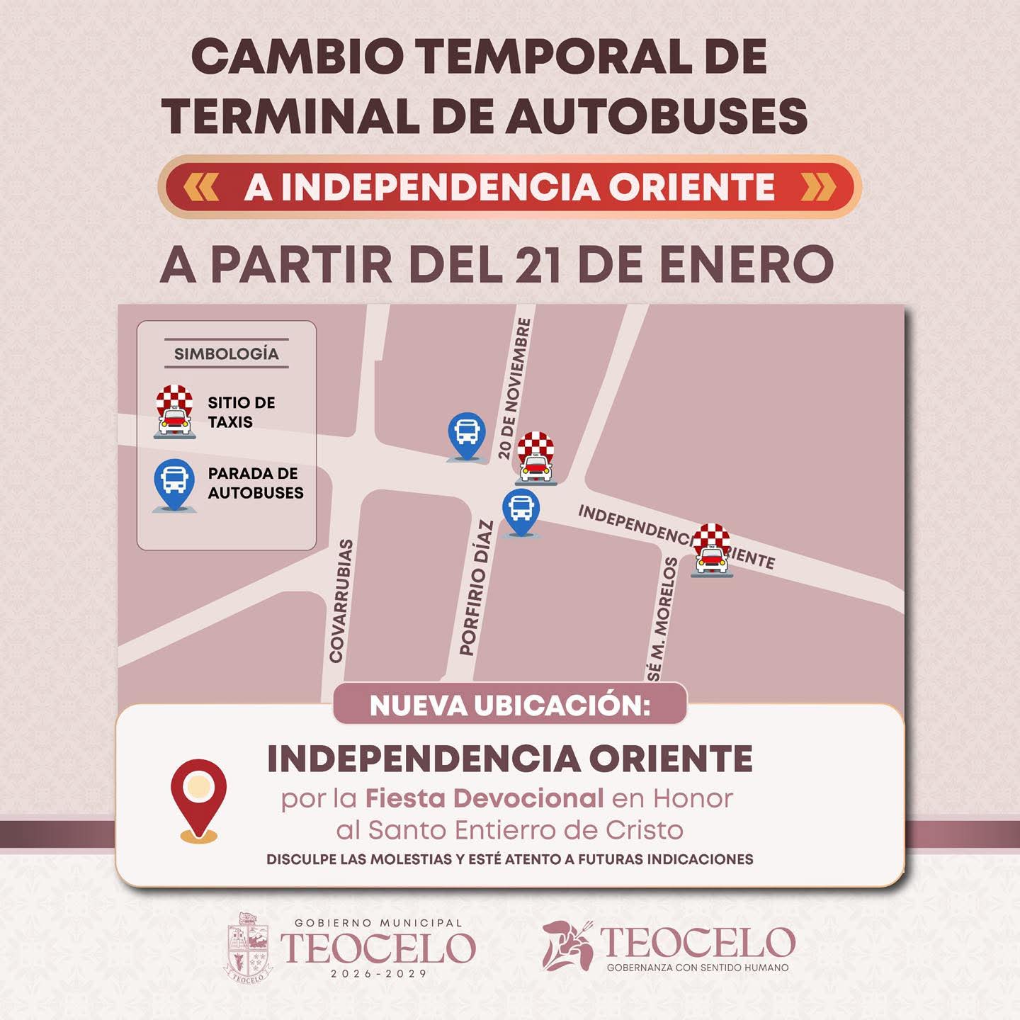 De acuerdo con el comunicado oficial, la nueva sede provisional de la terminal se localizará en Independencia Oriente, esquina con Bartolomé Morales, con el objetivo de facilitar el desarrollo de las actividades religiosas y garantizar el orden vial en la zona centro del municipio.