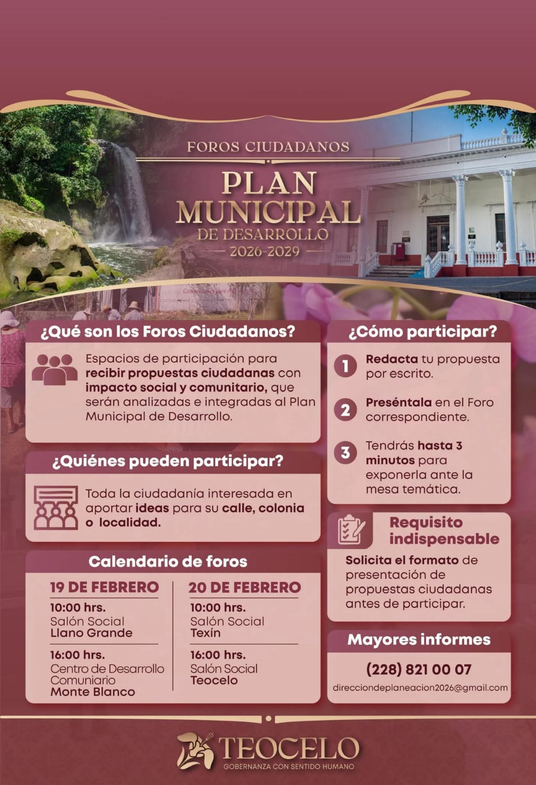 Teocelo. – El Gobierno Municipal de Teocelo lanzó la convocatoria para participar en los Foros Ciudadanos que formarán parte de la integración del Plan Municipal de Desarrollo 2026–2029.